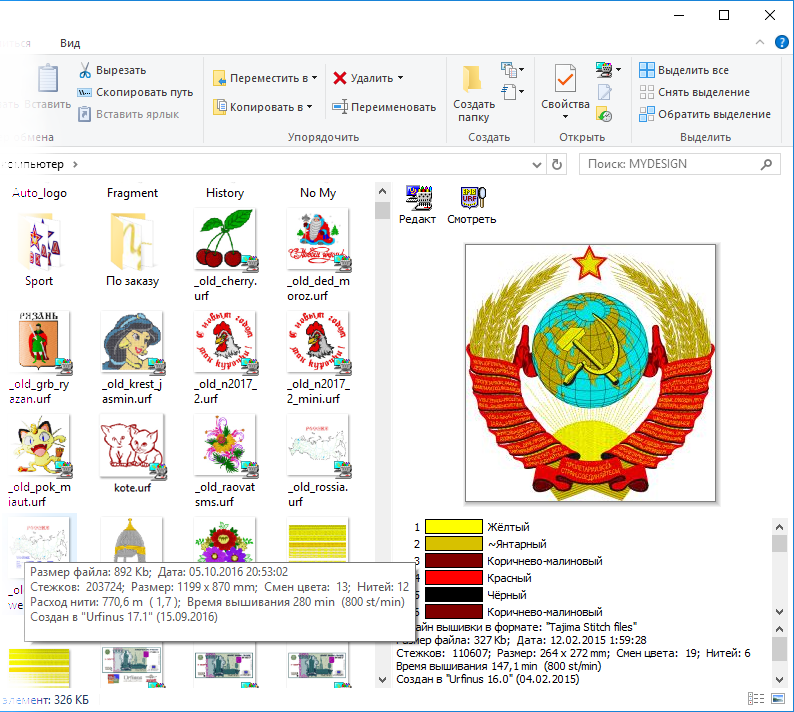 Начиная с версии 17.1.33 программы редактора вышивки Urfinus программа имеет возможность внедрить в проводник Windows специальное расширение. Теперь, что бы видеть содержимое дизайна машинной вышивки через его иконку не обязательно запускать редактор или просмотрщик вышивки. Прямо в проводнике Windows можно видеть содержимое дизайна, порядок смены цветов по порядку в цвете и с описанием цвета на русском, размеры, стежки и прочую полезную информацию. Текстовую информацию о дизайне можно увидеть на панели крупного просмотра справа или на всплывающей подсказке над файлом. Прямо из проводника можно запустить дизайн на редактирование или на просмотр.