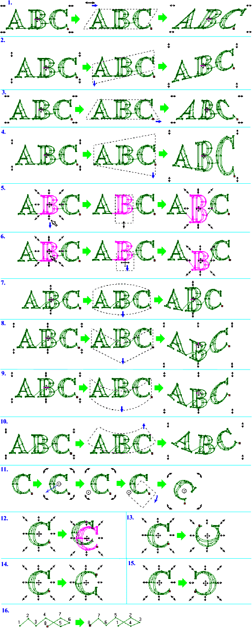 Все заполняемые объекты могут быть заполнены с применением различных техник заполнения, а также их различных комбинаций. 1-демонстрирующий объект, 2 и 3 -заполнение "Сатин", 4 и 5 -заполнение стежками, 6 и 7 -заполнение по трафарету, 8 -комбинация заполнений по трафарету и стежками (т.е. заполнение по трафарету, после в пустых промежутках заполнение стежками с учетом величины минимального стежка). Фрагменты 3,5,7 и 8 выполнены с включенным параметром 'Полные линии':