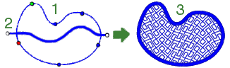 Область задается парными точками. Кривую форму могут иметь не только боковые описывающие линии, но и промежуточные направляющие линии. Заполнение производится параллельными полосами типа "Сатин" с указанной шириной. Кроме своих личных свойств, этот объект имеет полный набор свойств объекта "Сатин", в том числе эффект "Оттенок". Каждая полоса заполняется по очереди, частично перекрывая предыдущую.